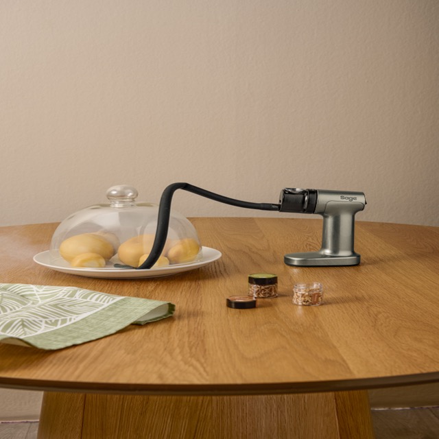 La Smoking Gun di Sage ti consente di regalare facilmente a cibo e bevande il tradizionale aroma affumicato, comodamente a casa tua. Utilizza un sistema di affumicatura a freddo leggero, che consente di affumicare anche alimenti delicati come gelati, burro o cocktail. Se cerchi un sapore più deciso, il controllo a due velocità della Smoking Gun consente di passare da un fumo delicato a uno intenso. La robusta base della Smoking Gun fornisce una piattaforma stabile e sicura che la mantiene in posizione durante l'uso.