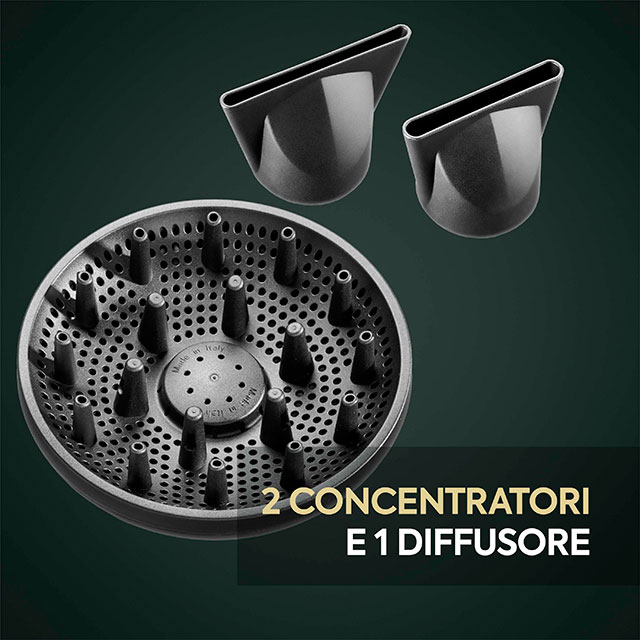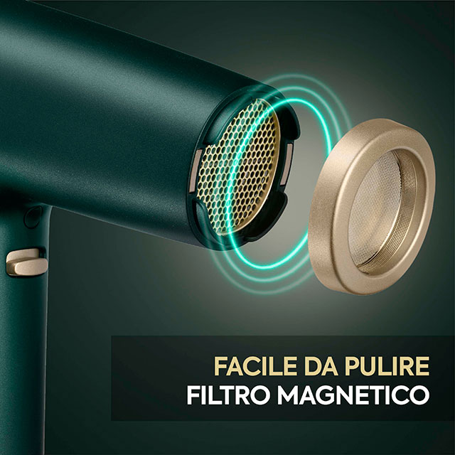 Dotato di filtro posteriore magnetico e di tre accessori inclusi, integra la funzione ionica anti-crespo per capelli sempre morbidi, luminosi e disciplinati.