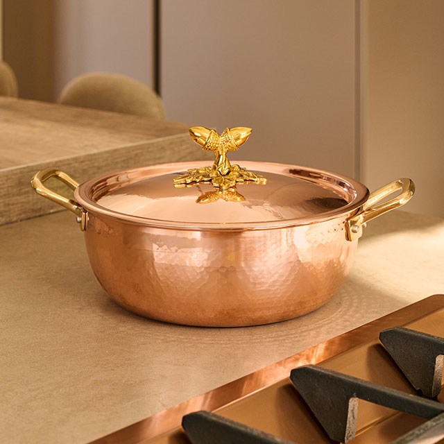 La casseruola Ruffoni Historia Decor è ideale per cuocere a fuoco lento risotti, salse, contorni e cereali, oltre che per stufare carni e preparare molte altre ricette. Il rame è un materiale pregiato, insuperabile per conducibilità termica e per l’eccellente controllo della temperatura.