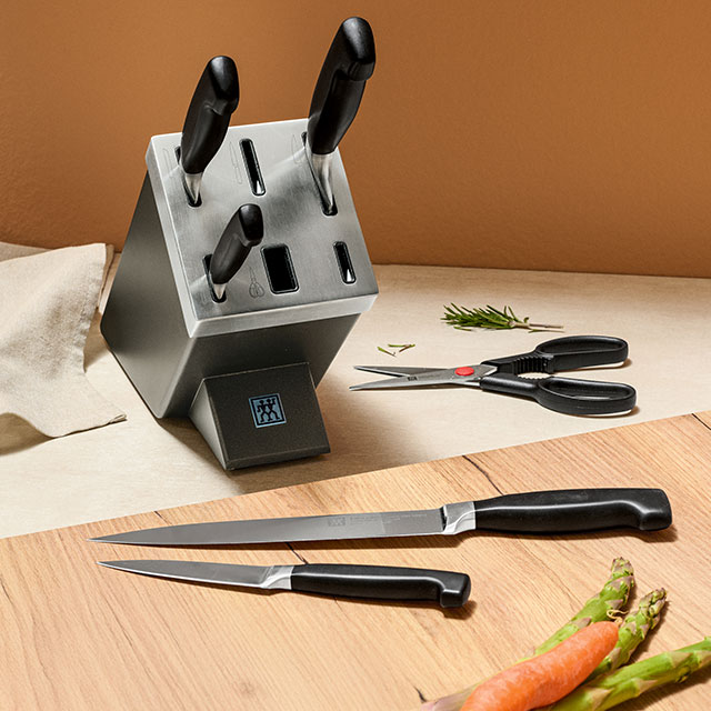 Elegante e resistente, include i coltelli della linea Four Star®: spelucchino, coltello universale, coltello da carne, coltello da cuoco, coltello da pane e forbici. Prestazioni e qualità made in Germany.