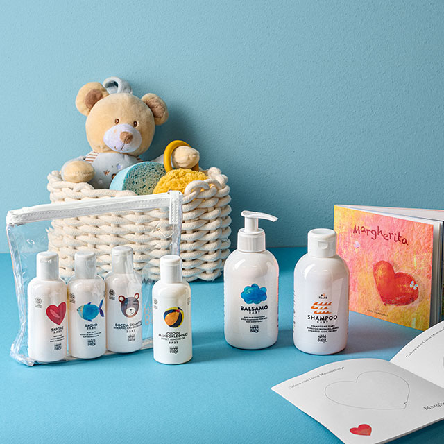 – pochette con 4 formati viaggio: Sapone Baby 100 ml, Bagno Baby 100 ml, Doccia Shampoo Baby 100 ml, Olio di Mandorle Dolci Baby 100 ml