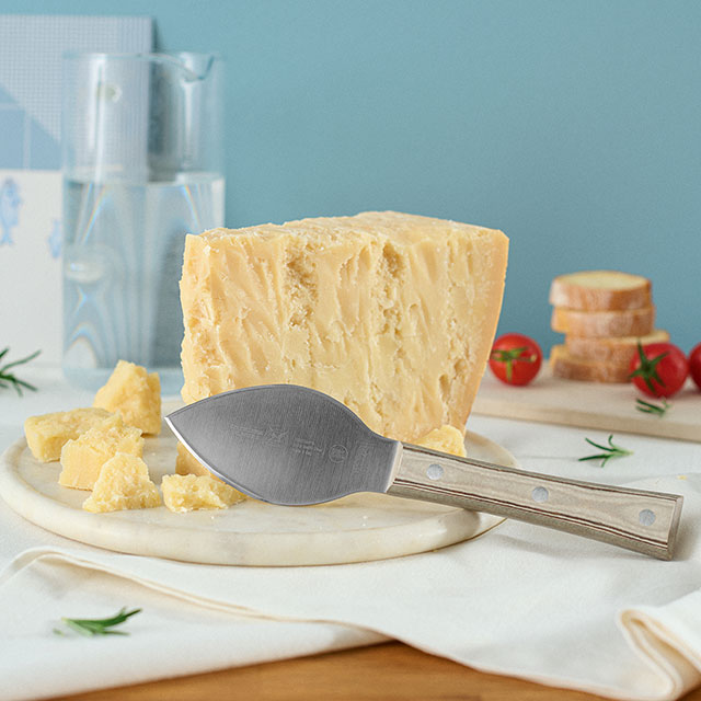 Questo speciale coltello è pensato per il taglio di grana e formaggi a pasta dura. La forma, a goccia con punta rivolta verso l’alto, è realizzata in acciaio alimentare di alta qualità. Il profilo della lama, affilata su ambo i lati, permette di incidere e separare i formaggi con precisione, rispettandone la struttura. Il lungo manico garantisce una presa sicura e valorizza un design essenziale e contemporaneo.