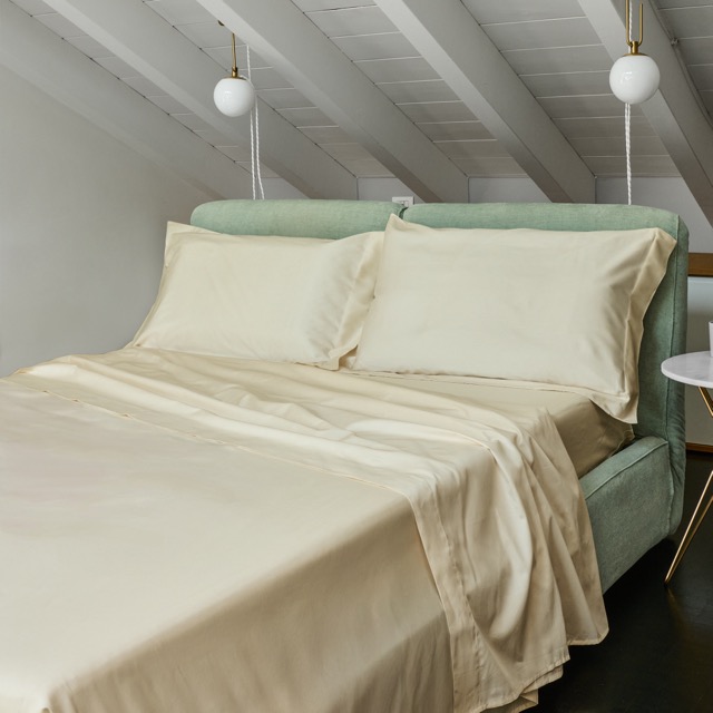 Dimensioni: lenzuolo sopra 260x300 cm, lenzuolo con angoli 180x200 cm, coppia di federe 52x82 cm a tre volani - Peso: 115 gr/mq - Tessuto: raso di cotone 300 TC - Colore crema - Prodotto in Italia