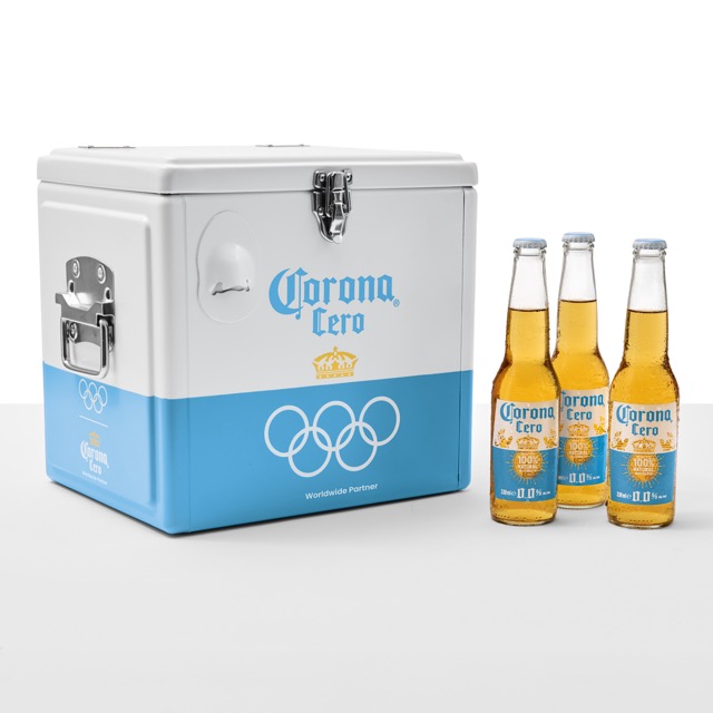 Un box termico da 15 litri munito di un apribottiglie frontale e di resistenti manici laterali. Il box può contenere fino a 12 bottiglie da 33 cl. Sono comprese 3 bottiglie da 33 cl di Corona Cero, la birra analcolica con lo stesso gusto rinfrescante e autentico di Corona e prodotta con soli ingredienti naturali.