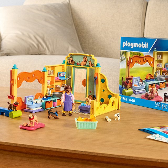La Casa per cuccioli PLAYMOBIL è il regno delle coccole. Lavaggio, toelettatura, pappa e pesatura: tutto è pronto per prendersi cura dei piccoli amici. I cuccioli possono riposare in comode cucce o esplorare liberamente l’ambiente.