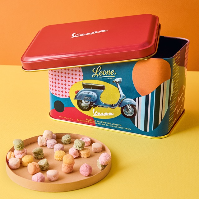 Un'elegante confezione in metallo da collezione, ispirata alla leggendaria Vespa: simbolo senza tempo di stile, libertà e italianità. All'interno, 250 grammi delle iconiche Pastiglie Leone: un mix di gusti freschi e fruttati, dissetanti e ricchi di carattere. Realizzate con ingredienti 100% naturali, senza conservanti, vegane e senza glutine, queste pastiglie sono un emblema dell'arte confettiera italiana custodita dal 1857. Una proposta regalo originale e raffinata, ideale per chi apprezza i sapori genuini e il design intramontabile.