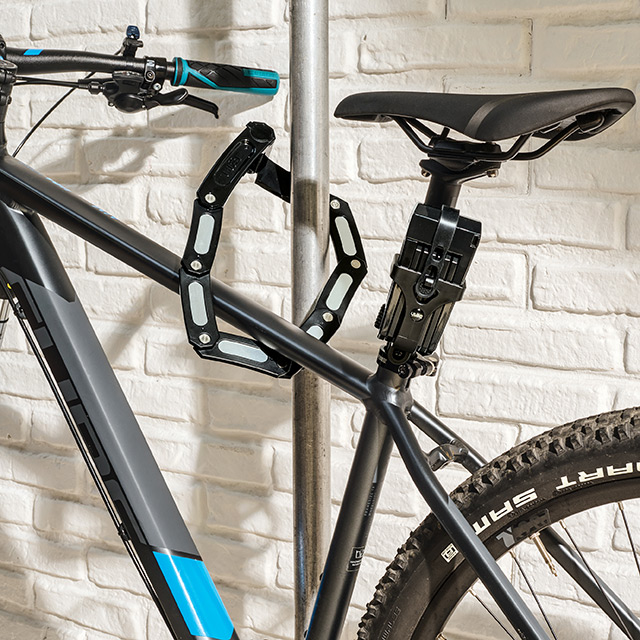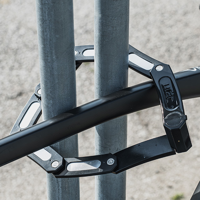Facile da bloccare grazie al cilindro di sicurezza brevettato push-to-lock, è dotato di un supporto comodamente posizionabile sul telaio di qualsiasi bicicletta tramite robuste fettucce tecniche.