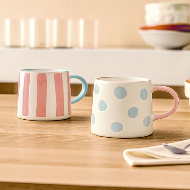 Nella collezione Geoset, le due mug esprimono vivacità ed energia grazie al ritmo delle righe e alla giocosità dei pois. Il rosa e l’azzurro si alternano tra bordi e manici, creando un equilibrio visivo perfetto per chi ama una tavola curata ma ricca di personalità.