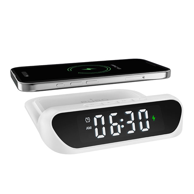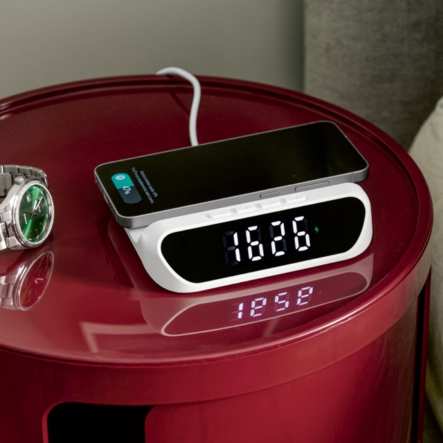Sveglia 2 in 1 con orologio digitale e caricatore wireless. È dotata di display LED chiaro e leggibile anche al buio con schermo retroilluminato. Ideale sia come sveglia, sia per ricaricare lo smartphone senza filo durante la notte. Un accessorio versatile e funzionale.