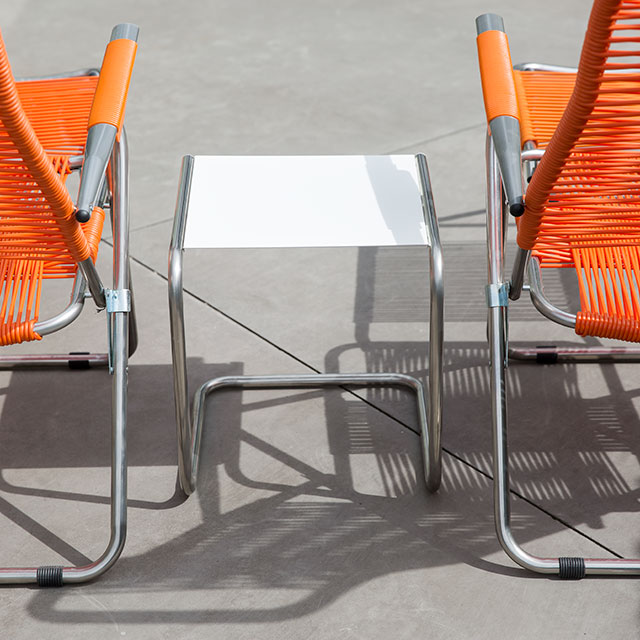 La seduta, intrecciata a mano in Italia con il caratteristico tondino in PVC, esprime artigianalità e qualità senza tempo.