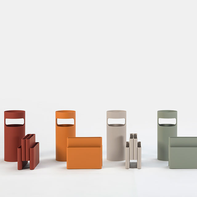 Caratterizzato da due aperture laterali, può essere utilizzato facilmente anche come gettacarte. Oggi è realizzato in materiale riciclato derivante da scarti industriali, con una raffinata finitura soft touch.