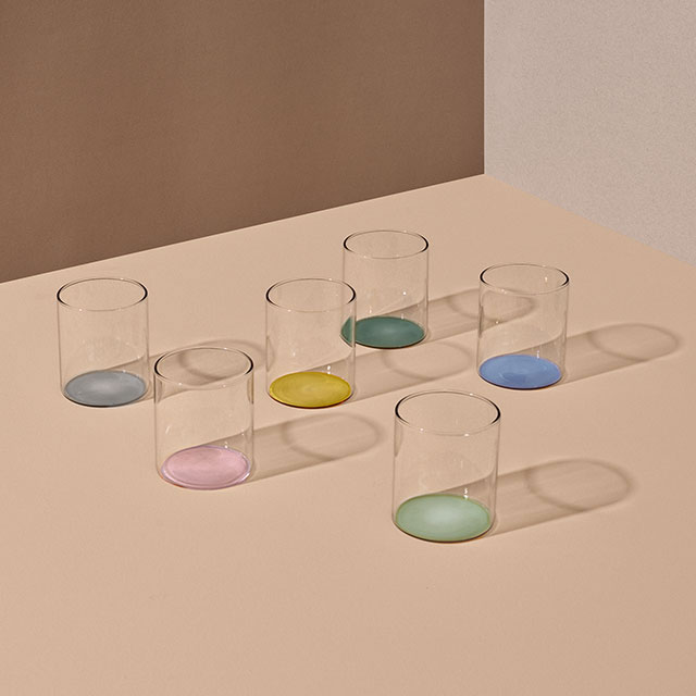 La collezione, in vetro borosilicato fatto a mano e modellato a lume, è caratterizzata da un fondello di vetro colorato in pasta, ideale per rendere unica la propria tavola.