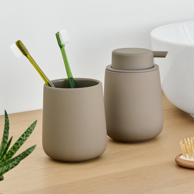 Il marchio Zone Denmark propone un set costituito da dispenser sapone e bicchiere portaspazzolino. Il materiale è costituito da porcellana rivestita di materiale gommoso che permette il gradevole tocco e l'ottima presa anche con le mani umide.