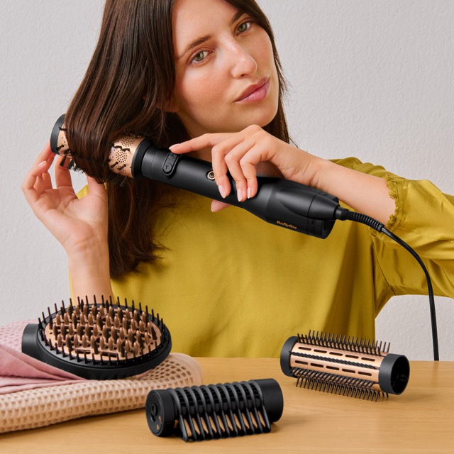La spazzola rotante Big Hair Luxe di BaByliss è dotata di 4 accessori intercambiabili con rivestimento in ceramica. È ideale per asciugare, modellare, lisciare e dare volume ai capelli. La funzione ionica anti-crespo rende i capelli morbidi e setosi mentre l'innovativo design permette al flusso d'aria di essere perfettamente uniforme lungo la superficie di ogni accessorio.
