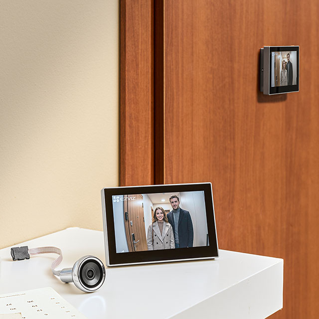 Lo spioncino Ezviz HP2 unisce una videocamera compatta a uno schermo interno elegante, consentendo di vedere i visitatori sia da casa sia da remoto, direttamente dallo smartphone tramite app.